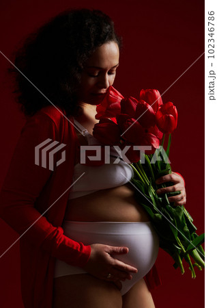 Side portrait of multi ethnic pregnant woman, expectant mother sniffing a bouquet of red tulips, gently stroking her belly, isolated on dark red background. Femininity, sensuality, pregnancy fashion