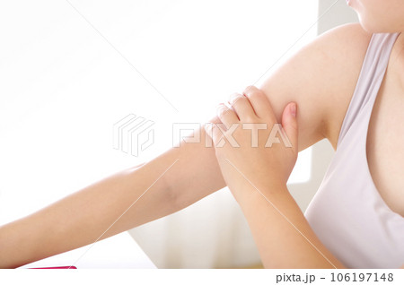 Close up of Chubby woman pinching upper arm fat. weight loss concept.
