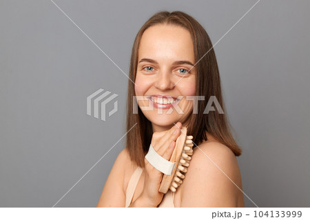 Image of attractive beautiful woman uses dry body brush wants to have smooth clean skin, massaging her shoulder and arm, looking at camera with toothy smile, posing isolated over gray background.