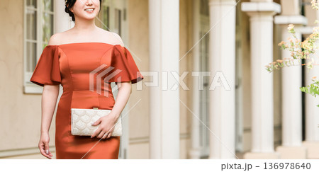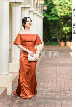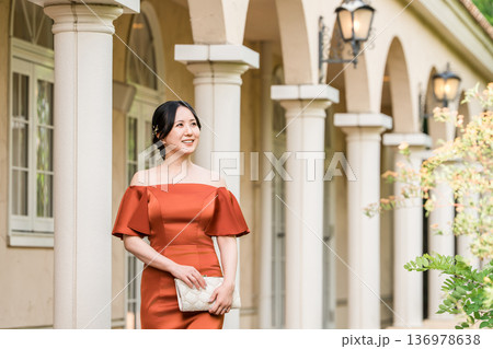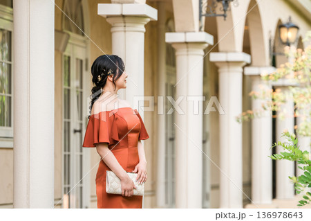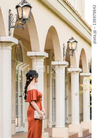 宮殿に立つカラードレスの女性,ドレスアップした新婦,富豪,富裕層