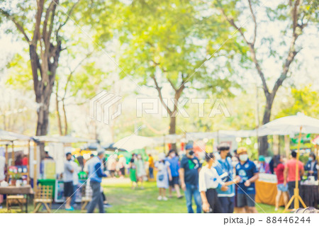 Weekend holiday park market with food and drink shop in the summer garden. leisure lifestyle blur for background.