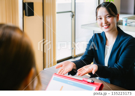 資料を見せて説明するセールスレディ―