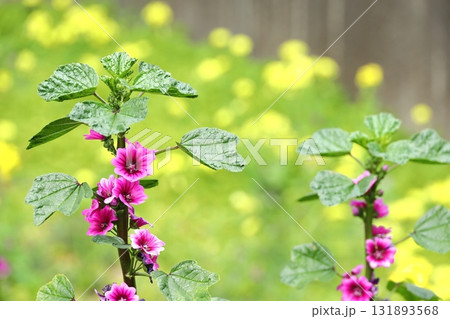 紫色のマロウの花の咲く風景