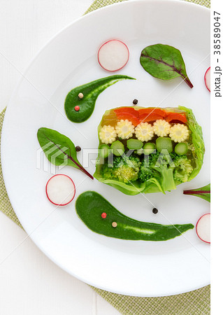 食べ物 春野菜 料理 フレンチ フランス料理 前菜 お惣菜 ゼリー寄せ ゼリー 冷製 野菜料理 透明 コンソメ オクラ しいたけ シイタケ ニンジン ベビーコーン ヤングコーン おもてなし テリーヌ