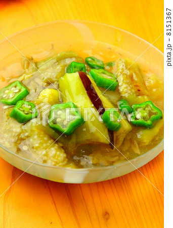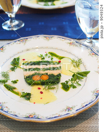 食べ物 春野菜 料理 フレンチ フランス料理 前菜 お惣菜 ゼリー寄せ ゼリー 冷製 野菜料理 透明 コンソメ オクラ しいたけ シイタケ ニンジン ベビーコーン ヤングコーン おもてなし テリーヌ