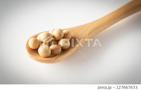 スプーンにのった大豆と大豆イソフラボンの文字 生豆 粒 豆類
