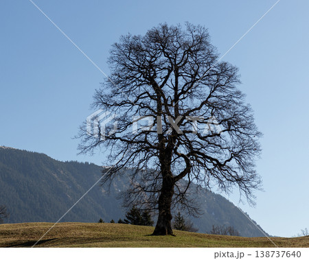 Solitary Leafless Tree on Rolling Hill with Mountain Backdrop