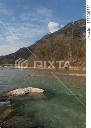 Clear Alpine River with Foreground Rock and Mountain Slope