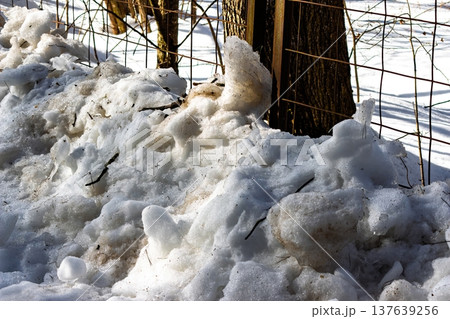 Glistening dirty snow piles slowly yield to the warming sun, hugging a rusty fence