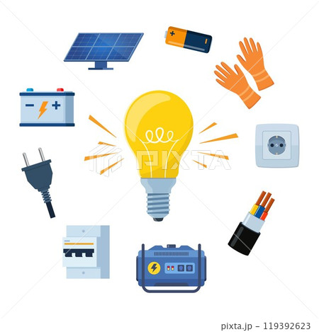 Essential Electrical Repair Tools for Professional Technician, Socket Maintenance Service. Electrician worker equipment for electric power system inspection. Electricity, energy concept. Vector.