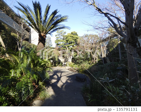冬の柔らかな日差しが差し込む庭園の散策路。ソテツの緑と木々の長い影が織りなす静かな午後の風景