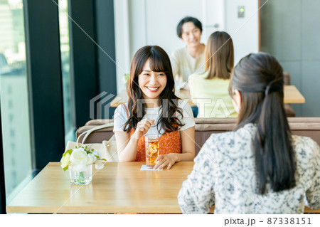 カフェで友達と団らんする若い女性