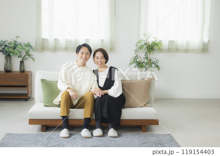 家のリビングでソファーに座る50代ミドル女性のポートレート