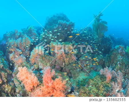 色彩豊かなソフトコーラルの群生、伊豆・伊東の海中風景素材