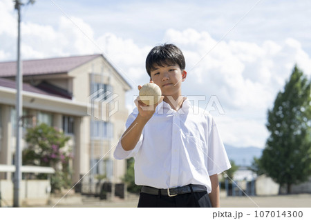 学校の校庭でボールを持つ男子中学生