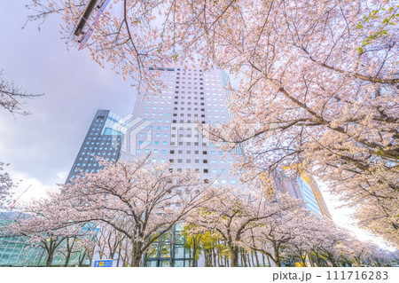 満開の桜と高層オフィスビル