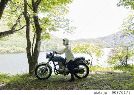 湖畔でバイクで来て景色を眺める若い女性 バイク女子