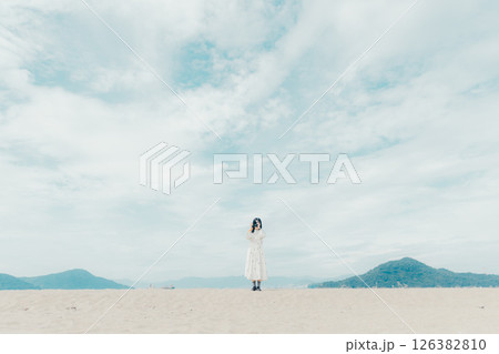 海辺に立つナチュラルな装いの若い女性