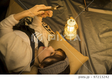 テントの中でスマホ見る若い女性 ソロキャン キャンプイメージ