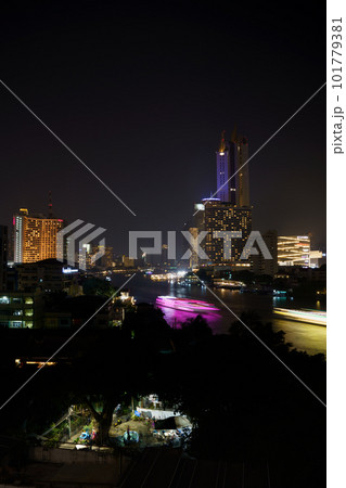 チャオプラヤー川の夜景(下町とクルーズ船)
