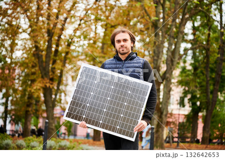 Portrait of man holding solar panel, stands in park. On background autumn trees and blurred city elements highlights integration of sustainable energy with everyday life.
