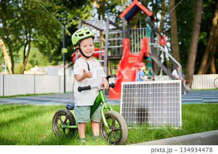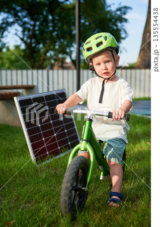 Young boy sits on green balance bike next to solar panel on grass. Kid wearing green helmet, looks at camera. Background features fence, trees, and bench. Concept of green energy generation.