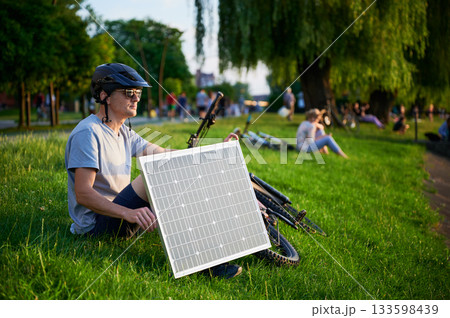 Man cyclist using solar panel for charging electric mountain bike outdoors. Guy wearing helmet and sunglasses sits on grass in park, enjoying sunny evening.