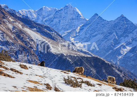 ネパール エベレスト街道にて放牧中のゾッキョの向こうに見えるヒマラヤの高峰群