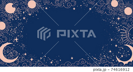 Blue magic background with stars and space decor with copy space. Layout for astrology, tarot, prediction. Divine boho design, hand drawn vector illustration, vintage style.