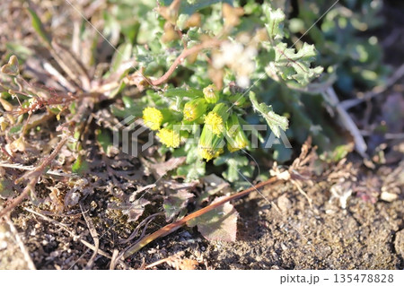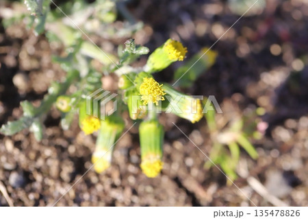 冬の道端に咲く黄色い小さなノボロギクの花