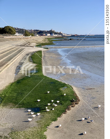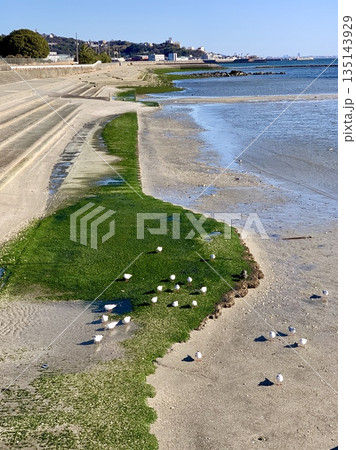 青空の渚に集うユリカモメ〈竹島海岸/愛知県蒲郡市〉