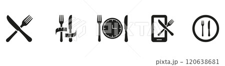 Diet and Meal Management Silhouette Icon Set, Featuring Cutlery, Time, and Mobile Tracking Symbols. Meal Timing Glyph Sign. Isolated Vector Illustration