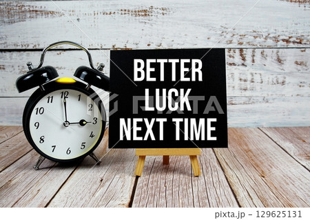 Better Luck Next Time text with easel and alarm clock on wooden background