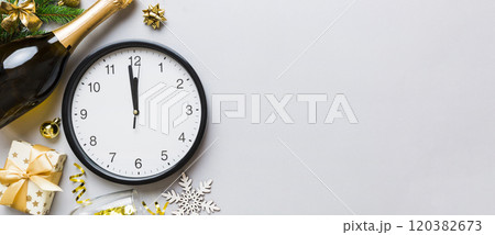 New year celebration concept with a bottle of champagne and two glasses toasting. Christmas gift box, alarm clock and fir tree branch on colored table. Top view Copy space