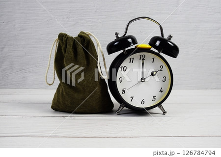 Time to Saving Concept money bag and alarm clock on wooden background