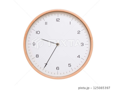 Minimal wall clock with light wood frame and white face displaying 09:35 or 21:35. Perfect for clean, modern concepts about time and scheduling.