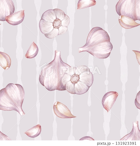 Seamless pattern featuring watercolor garlic bulbs and cloves scattered over soft vertical stripe background. Design for kitchen textile, restaurant decor or cooking blog background