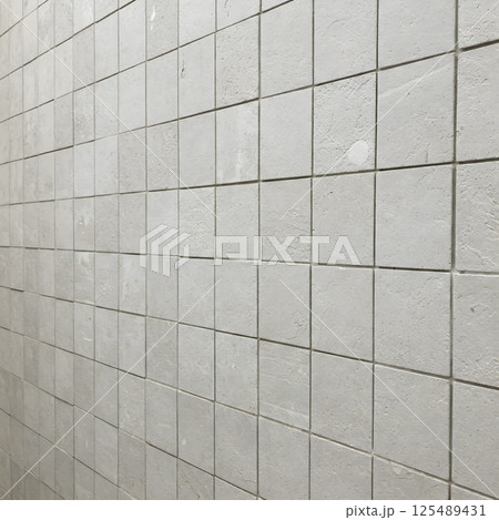 A wall covered in many light gray square tiles with dark grout lines is shown at an angle