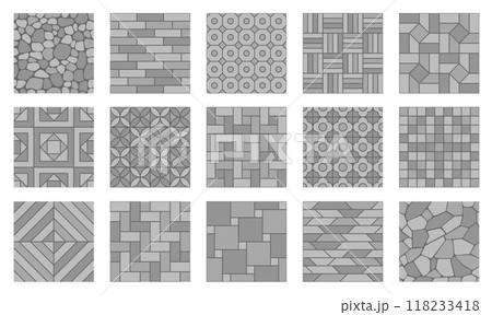 Grey stone pavement seamless patterns. Street paving background with vector rock texture of cobblestone, pebble, brick and flagstone. Pavement pattern floor tile, road, path and sidewalk paving motif