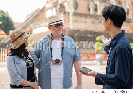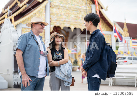 Old white man and asian woman tourist standing talking with guide in front of buddhist golden temple