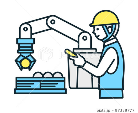 人と協力しながら働く産業用ロボット。協働ロボットのベクターイラスト素材。。