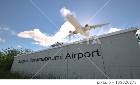 Arrivals at Bangkok Suvarnabhumi Airport with airplane landing near terminal, Bangkok, Thailand 3D rendering