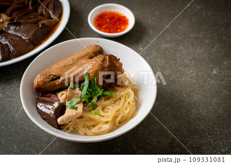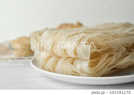 Delicious fresh Asian noodles with pieces of vegetables, meat, with salt, spices and herbs