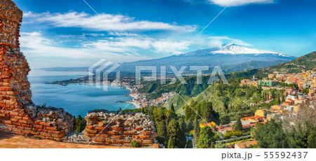 Taormina Ancient Theatre, Etna volcano aerial view, Sicily