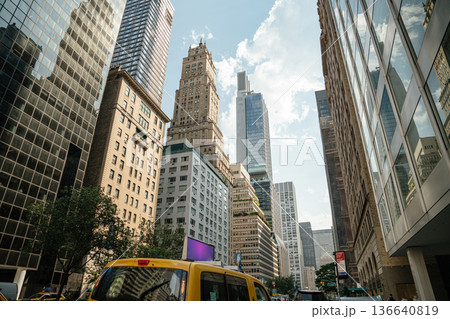 A yellow taxi drives down a bustling street in Midtown Manhattan. Historic and modern skyscrapers rise into a bright summer sky.