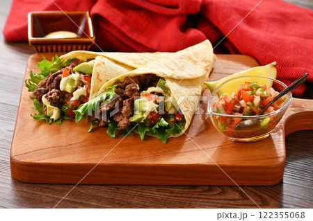 トルティーヤ、タコス、タコ、メキシコ料理。牛肉とサルサソースの野菜巻き、アボカド入り。