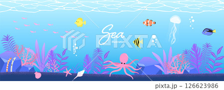 Game ocean underwater background with cartoon sea animal characters, algae seaweeds, sunken ship and rocks, coral reefs and sand bottom. Underwater panoramic background with whale, narwhal and beluga
