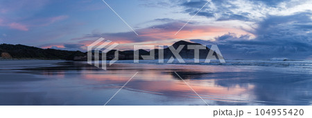 ニュージーランド 夕焼けで染まった空とファラリキ・ビーチ