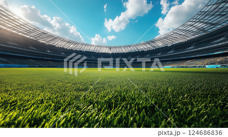 Large soccer stadium with green field under bright blue sky with scattered clouds. Stands empty, and sunlight streams through open roof.