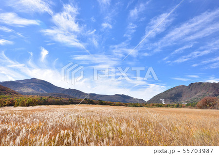 長者原タデ原湿原に広がる秋のススキ草原と山並みの高原風景